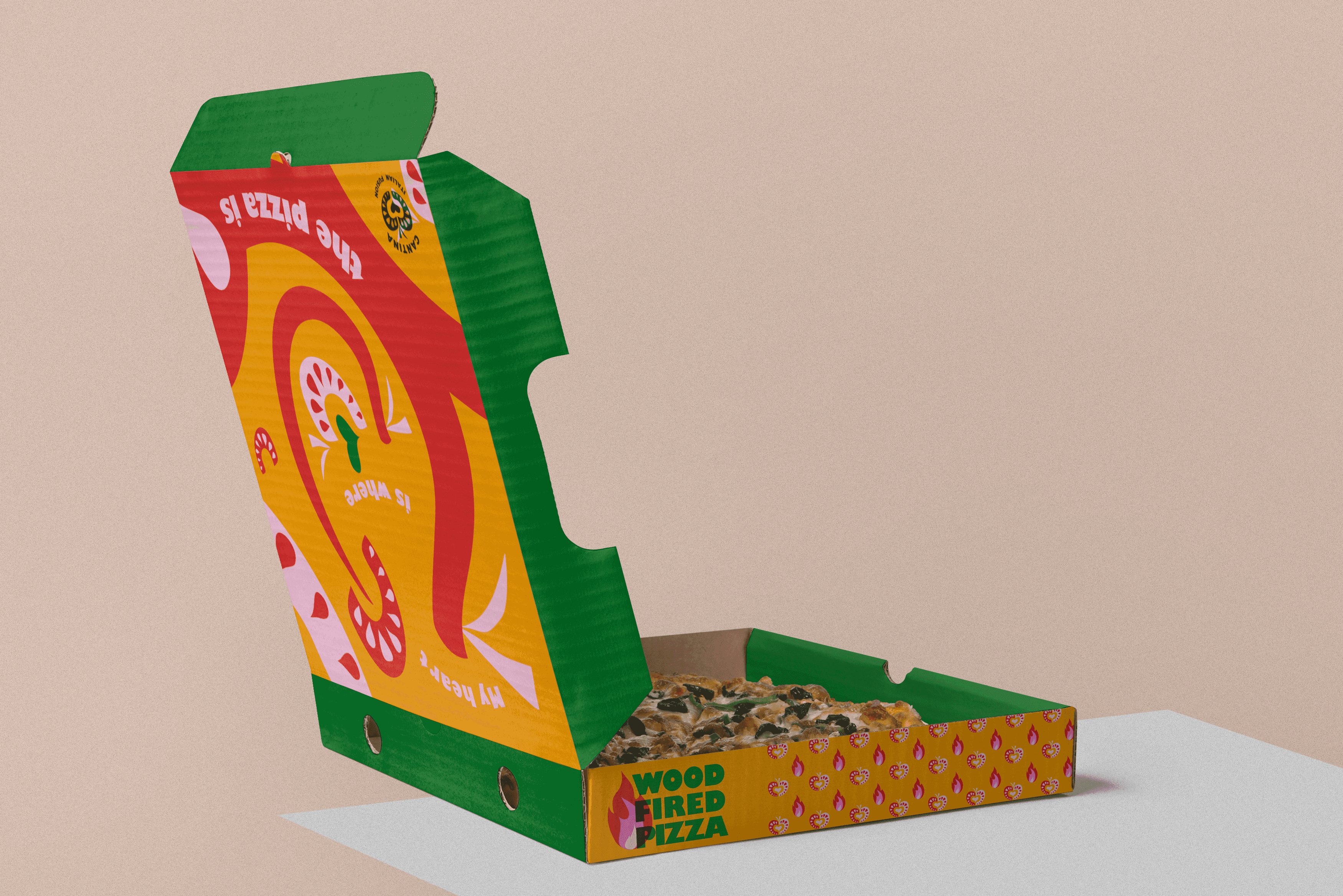 In the shape of the tomato, I found a letter C and a heart shape, and a playful concept flowed from there...The tag-line ‘My Heart Is Where The Pizza Is’ was crafted to align with the playful nature of the brand.